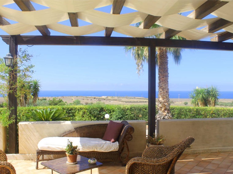 Terrazza anteriore coperta ed attrezzata che domina la vista sulla famosa baia di Macari e sulle isole Egadi.