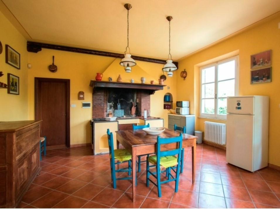 Cucina: lavastoviglie, fornelli, forno, frigorifero, microonde, tavolo, camino